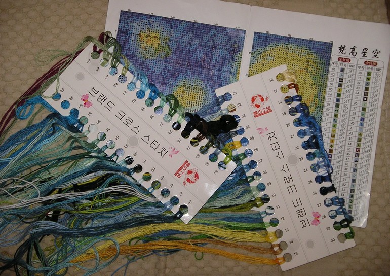 Существенный плюс, что производитель приложил печатную схему, рисунок на канву был нанесен аккуратно, но из-за обилия цветов (58) некоторые символы были похожи.