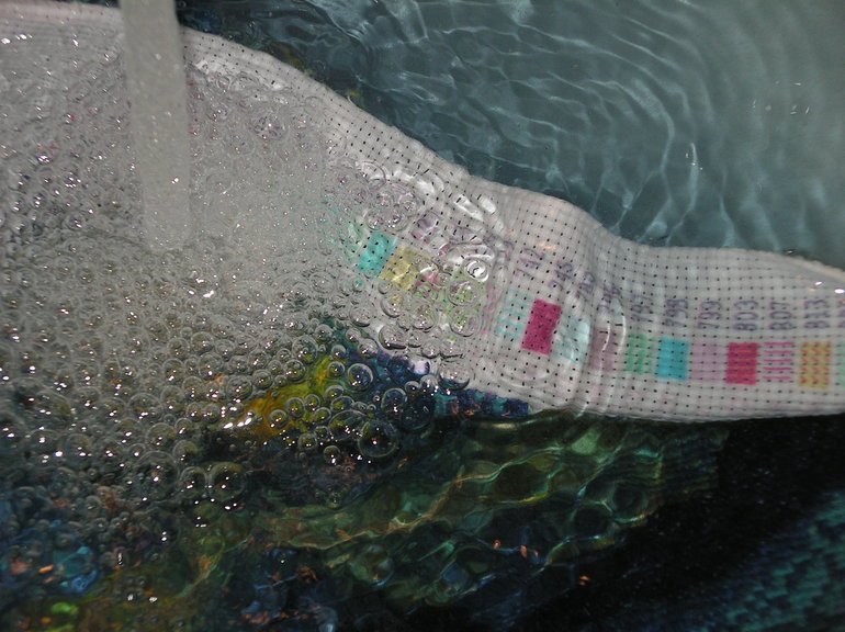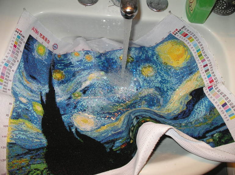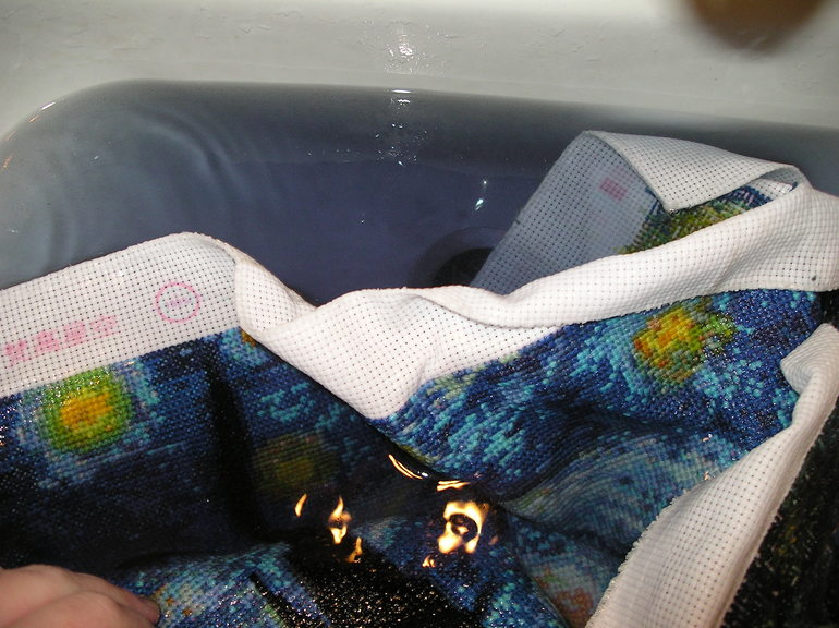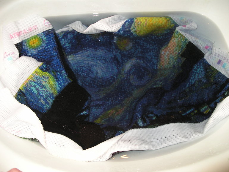 Впереди волнительная стирка, не знаю как поведет себя краска с канвы, переживаю как бы не окрасила светлые нити, может зря переживаю, посмотрим. :)