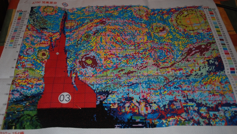 Вообще, когда постоянно отвлекаешься (ребенок требует внимания :))), нанесенная схема на канву очень выручает. Но будь каунт поменьше, выглядело бы лучше.
