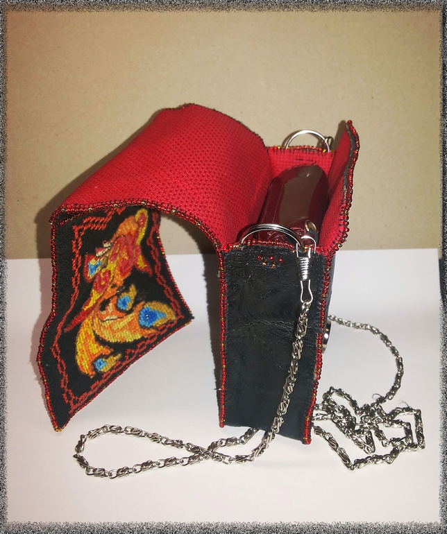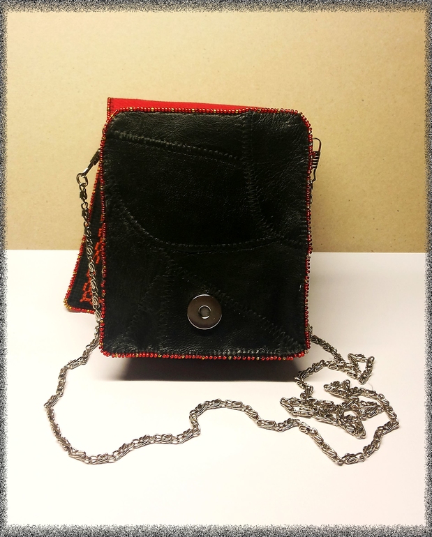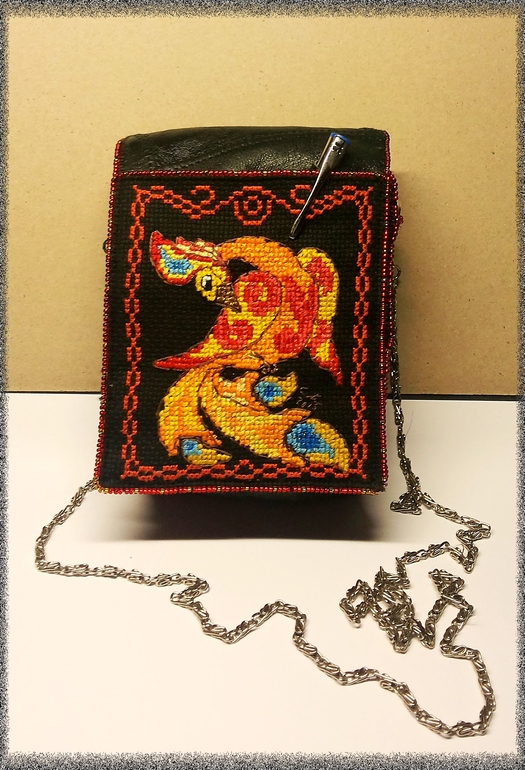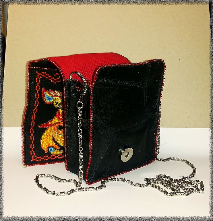 Окантовка - красным и золотым бисером(Блин, все пальцы болят!!! Дошивала на работе, я же вумная, нет, чтобы взять с собой плоскогубчики, знаю же, что кожа трудно шьется! А не, не надо...), ручка - цепочка... но вот она - не окончательный вариант, наверное, цепочка неприятно цепляет волосы, скорей всего, ее заменю, но тоже на цепочку, просто на обычную. Подкладка - красная канва... Сначала хотела ее тоже вышить, да вовремя себя остановила)))