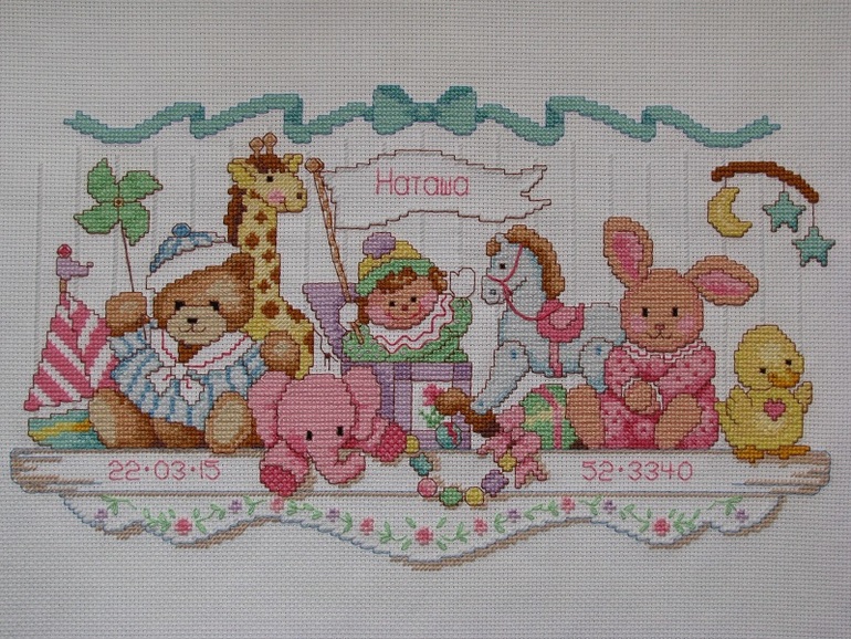 Закончить вышивку до родов я, конечно, не успела. Так что бэкстич, французские узелки и прочие украшательства доделывала уже с малышкой на руках. На это ушло столько же времени, сколько на саму вышивку. Но все-таки я это сделала!