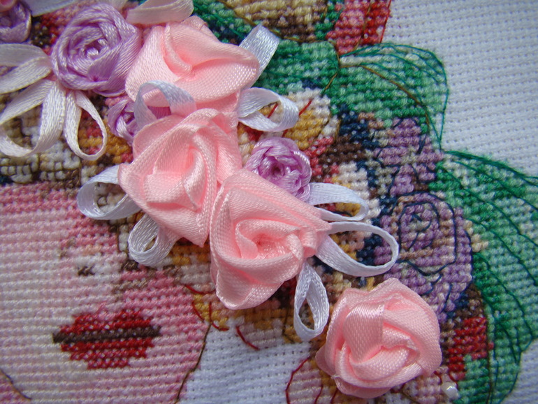 Вышиваю я как всегда подбором, причем абсолютно не точным. Нитки мне достались в наследство от тети, так что качество всяко-разно. И еще это первая вышивка, на которую у меня не хватило ткани, поэтому 10 крестов сверху и снизу обрезаны. А все случилось из-за того, что изначально планировалось вышивать на льне, а при вышивке на льне крестик сплюснут немного, и вот я посчитала крестики на льне и смотрю, что уместится в рамку 20 х 30, подумала, что это кльово и отложила вышивку на неопределенное время, а когда пришло время вышивать решила заменить на равномерку и не чертить клеточки так как много не зашитых участков. Естественно вышивая от середины, недостачу ткани я обнаружила вышив почти половину работы, но меня это мало огорчило, так как я не очень придерживаюсь оригинала, то и такая "неприятность" меня мало волнует. Сразу скажу, что и ленты у меня отличаются по цвету, и бисер, ну и французские узелки на шляпе я тоже заменила на мелкий бисер. Единственное, что меня радует, что стоимость моей вышивки практически никакая, все что я купила это кусочек ткани, бисер и ленты, а это копейки по сравнению со стоимостью набора. Ну и самое главное фото.