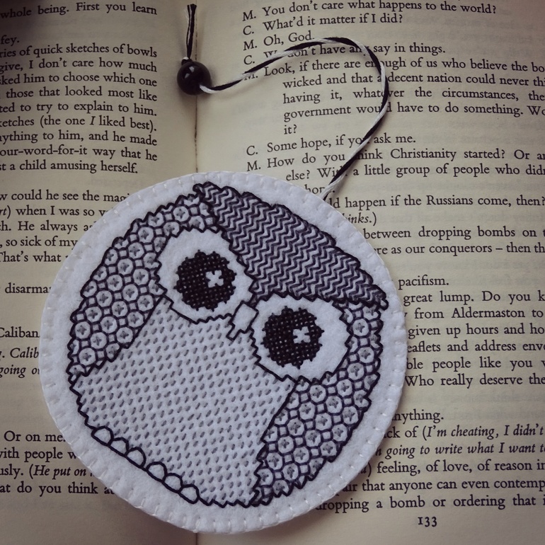 БлэкворкВышилась вот такая совушка-закладка. Вышивала на фетре с помощью водорастворимой канвы. Использовала 3 цвета - чёрный и 2 серых. Схемка где-то 50*50 крестиков.![]()