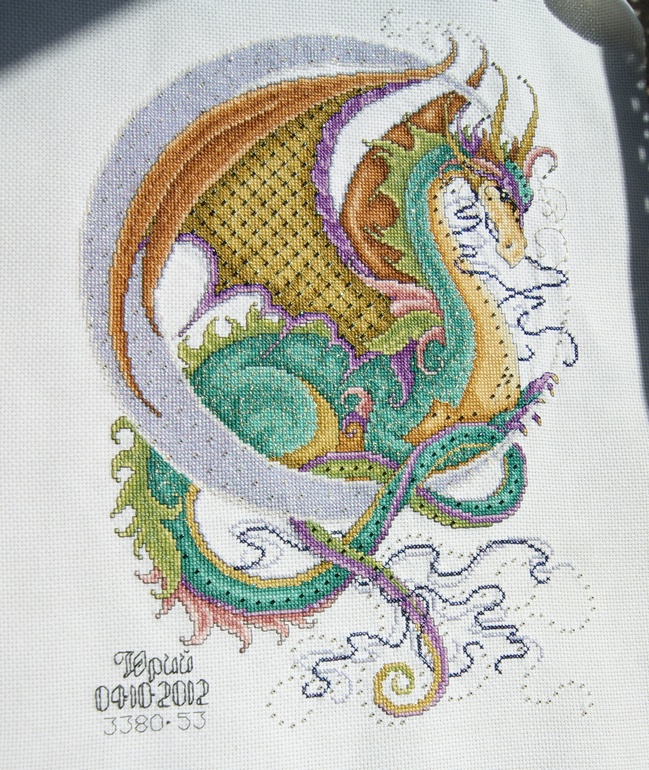 Design Works №2717 "Celestial Dragon" Вышивала по схеме Джоан Эллиот из интернета, подбор, нитки DMC, сделала вышивку-метрику второму сыну (он родился в год дракона), так как первому сыну тоже делала метрику по дизайну Джоан Эллиот!Пока не оформлена, хочу оформить две вышивки в одинаковой раме