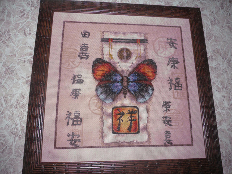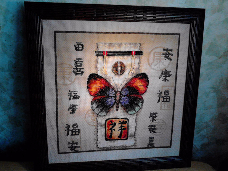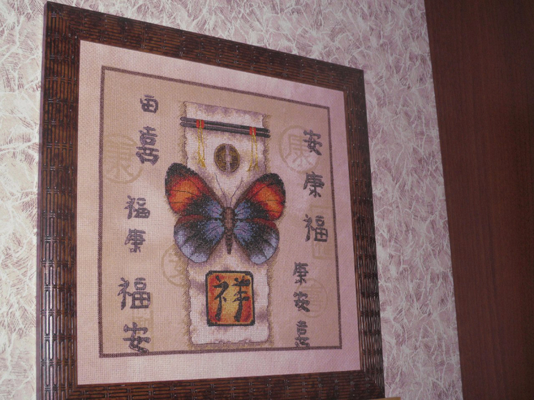Все оформление обошлось ровно в цену рамки, которая стоила рублей 250. Стекло я на вышивки никогда не делаю, поскольку хорошее мулине и канва проходят обработку, в том числе и пылезащитную. Картина висит уже года три - ни одной пылинки на нее не садится. А при отсутствии стекла, вышивка смотрится очень фактурно, что мне и нравится.
