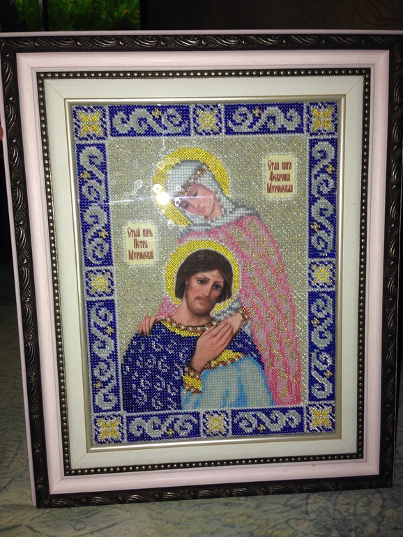 закончила икону, оформила и уже успела освятить)) набор фирмы Паутинка качество понравилось, результат очень нежные цвета смотриться потрясающе))