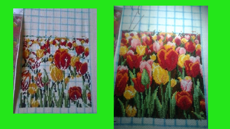 Всем привет! Ришка,ты гений!Здорово придумала про фото вышивок в начале поста!Как же приятно смотреть на работы наших тружениц!Девочки-вы молодчинки! Я на этой неделе тоже хорошо поработала(мне так кажется).Заполнила все пробелы во фрагменте.По сути,лист закончила,остался только бэк! Корабль не трогала,нет пока желания и возможности.Буду продолжать тюльпаны.Хочи вышить все поле.Там не много,где-то 1500 крестиков.И бэк в этой части картинки вышить нужно,чтоб завертуть под раму. Всем ровных крестиков и плодотворной недели!
