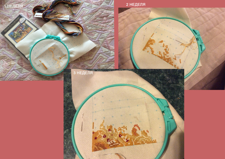 Всем привет! Сегодня я наконец-то первый раз за все ВД отчитываюсь с компа. У меня на этой неделе случился долгожданный трехдневный отпуск, во время которого я планировала загорать, наслаждаться летом и проводить время со своим карапузом, место этого я сломала палец на ноге и получила полностью загипсованную стопу. Сидеть без дела я конечно не могла, летом на даче много дел, но все же у меня получилось даже немного повышивать, вот мои успехи за три недели ВД