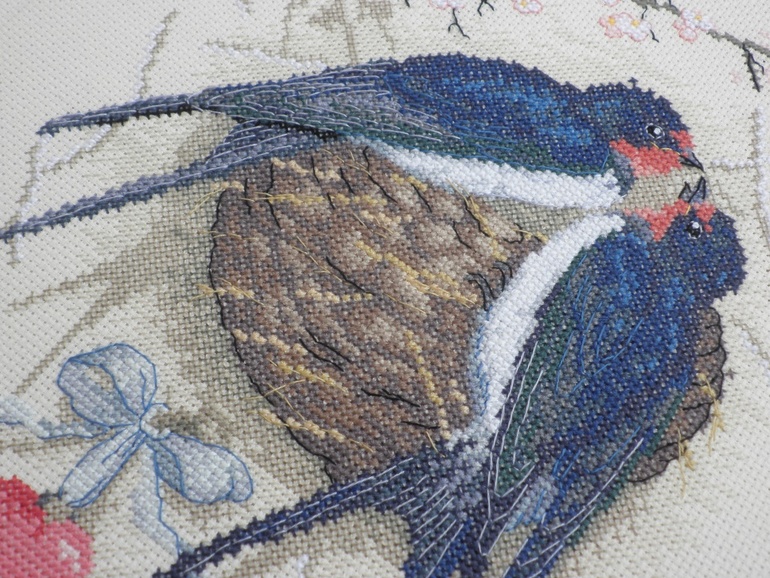 "Ласточки". Сюжет можно использован в качестве свадебной метрики.Вышивается на Аиде14,размер 18*25см,29 цветов мулине.