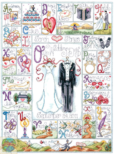 Смысл такой. Там вышиты предметы одежды. Самое первое, что бросается в глаза - это свадебное платье и свадебный костюм. Кажется, на плечиках.