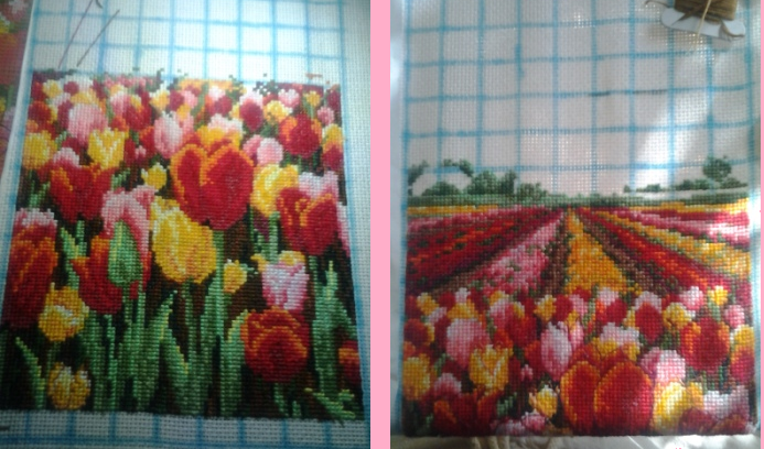 Я на этой неделе доколупала само поле и зелень и отбэчила тюльпаны.План на след.неделю-вышить мельницу!