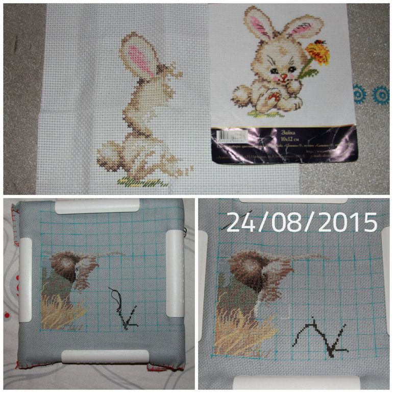 Зайчика от Алисы вышиваю ночью на работе, Слонов не получается с собой брать - очень громоздкие. Поэтому Слоны шьются дома, а Зайчик на работе.