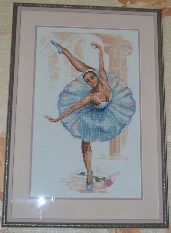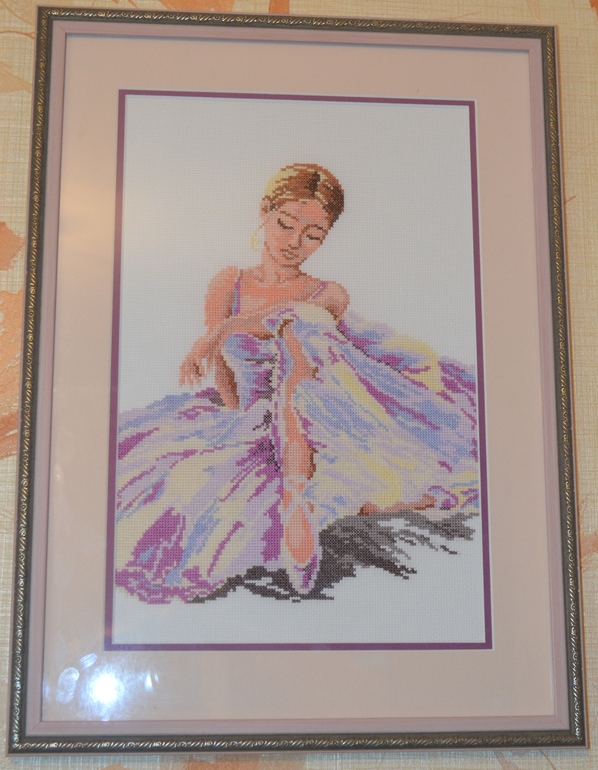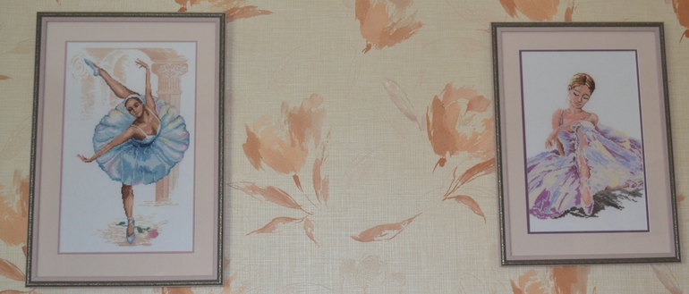 Одна из них вышивалась в больнице, поэтому скорость была очень высокой)))), и за неделю Балерина в розово-сиреневых тонах была готова, а Голубая "жила" у мамы, поэтому вышивалась примерно 1 час в неделю))) и ооооочень оттянула момент оформления, т.к оформлять естественно хотелось в одном стиле...