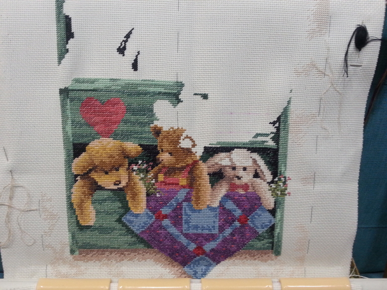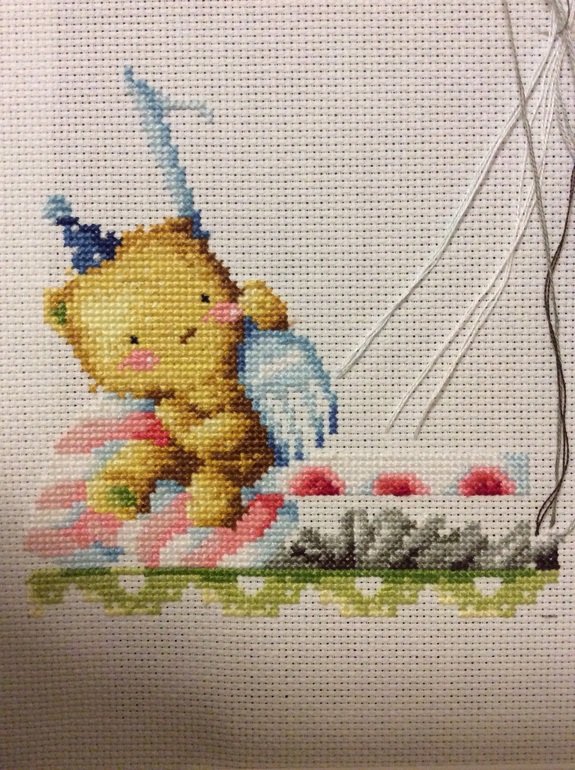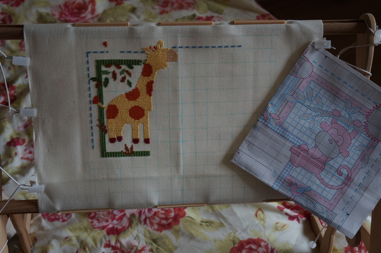 Девочку я вышивала на улице (во время прогулок с ребенком), а мишки у меня дома на станке.