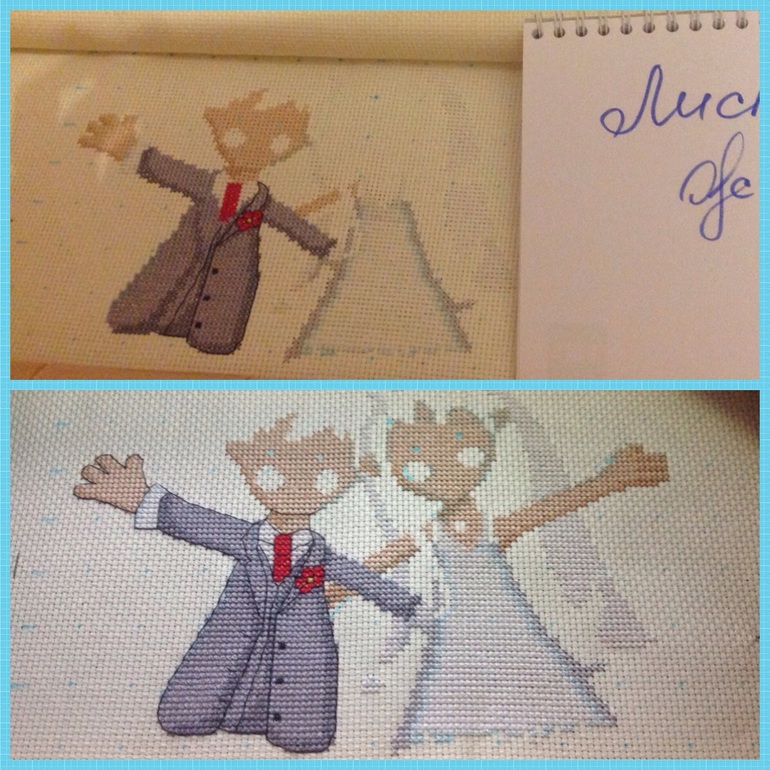 Дааа, вот пальцы хотела исправить и вышить металликом кольца обручальные, потом передумала, решила оставить мультяшность ))
