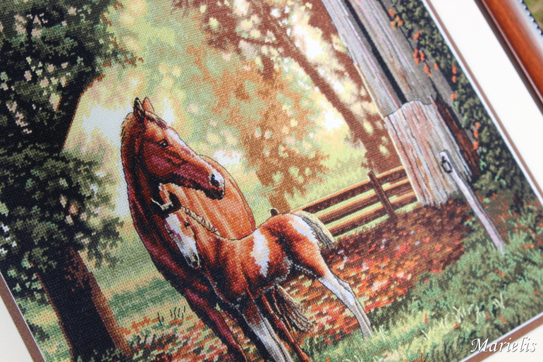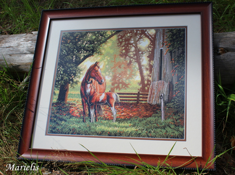Mare and Foal - лошадь и ее жеребенок: материнская любовь, материнская защита и невинный детский взгляд. В планах у меня этой работы не было, пока не родилась дочка. Тогда я поняла, что эта вышивка должна быть у меня, от нее веет теплом, нежностью и заботой. Работа, в основном, вышивается, полукрестом , вышивается легко, не было ни мгновенья, когда я уставала бы нее. Не секрет, что я люблю вышивать Дим, и именно от этой работы я получила море удовольствия.