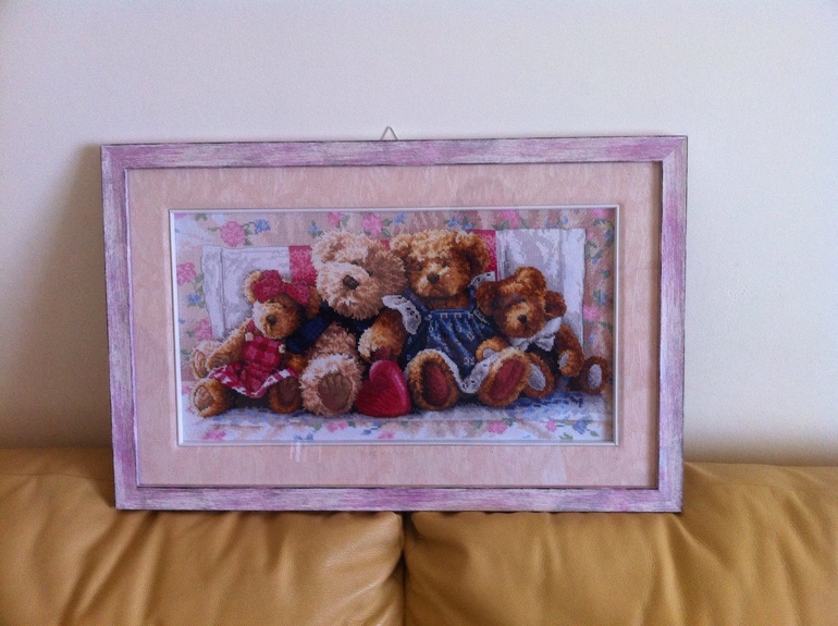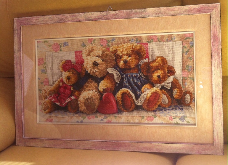 О работе: это мой первый набор Дим. Очень мне понравилось вышивать этих мишек. Вышилась наша семья: мама, папа, старшая дочка и младший сынок :)