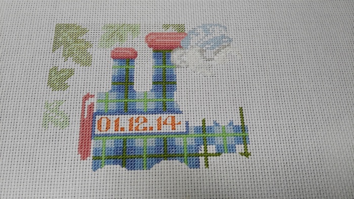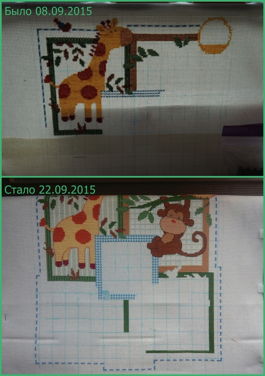 Привет, девчонки! Меня отпустили домой (за выпиской и швы снимать пойду завтра), поэтому я очень надеюсь, что вы мне простите сразу двухнедельный прогресс в фото (в прошлый вторник не выкладывала и решила два коллажа делать не стоит). Если честно, я в больнице немного от вышивки подустала (монотонные цвета), поэтому у меня в паре мест даже недошитые крестики. А еще (да простит меня дименшнс) я сделала в схеме коррекцию. Я уже где-то в комментах писала, что в этом дизайне исключительно крест, фрузлы (3 или 4 штуки) и бэк. Ну очень скромный набор (совсем не димовский). Поэтому я (а также моя лень) решили немного изменить дизайн и вышивать фон каждого квадрата полукрестом. Как мне кажется, картинка от этого только выиграла (а я сэкономила время и силы))))