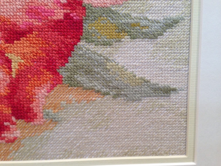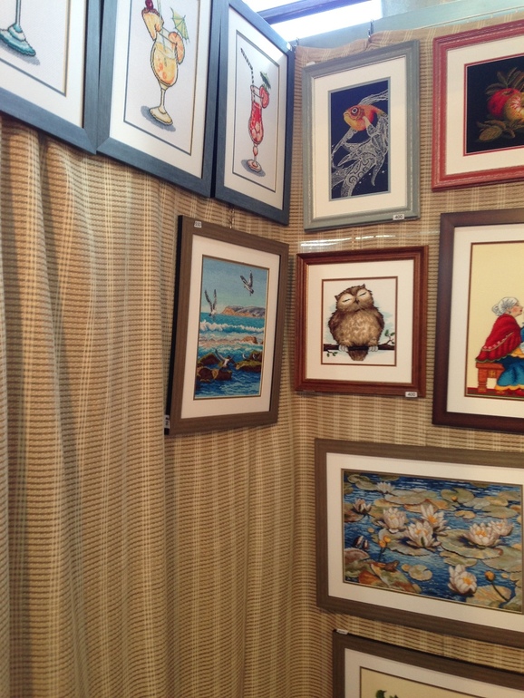 Здесь вышивка висела сбоку и не удалось запечатлеть нормально, но это моё! А именно - море с чайками. И пробираясь к ним, кувшинки мною остались не замечены. Только дома на фото рассмотрела. Тоже приятная, но как-то темновато. Будто с фото темного делали. В природе как-то натуральнее.