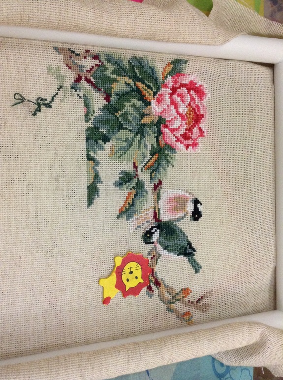 стало вот что,покажу углы и общий план. дошила верхний левый угол,все ягодки,ветки,фон. ушла в низ, начала третью птицу, переставила пяльцы с кота)))