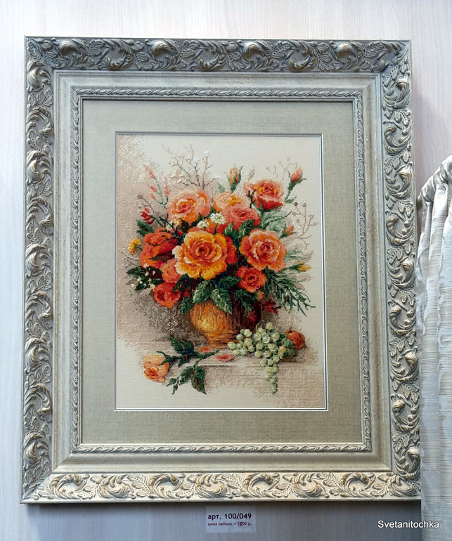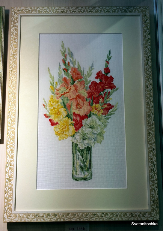 Моя задумка с "Фламандским летом" тоже не удалась, просто этот набор на выставку даже и не привезли!!! Ни в вышитом виде, не в виде набора!!! Я была второй раз шокирована Риолисом, когда девушка - продавец на мой вопрос о том, есть ли в продаже "Фламандское лето" радостно ответила: "А мы не привезли этот набор, мы привезли чайные розы, решили два одинаковых набора не брать!!!"