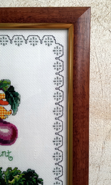 Оформлением не очень довольна, потому что той рамы, которую я хотела, не было в нужном количестве, да и багетка в связи с кризисом перестала закупать антибликовое стекло, только обычное и музейное. Музейное для такой работы было бы слишком жирно, так что пришлось довольствоваться обычным, которое я не люблю. Но вроде в целом неплохо получилось, родителям нравится и в интерьер вписалось хорошо. ))