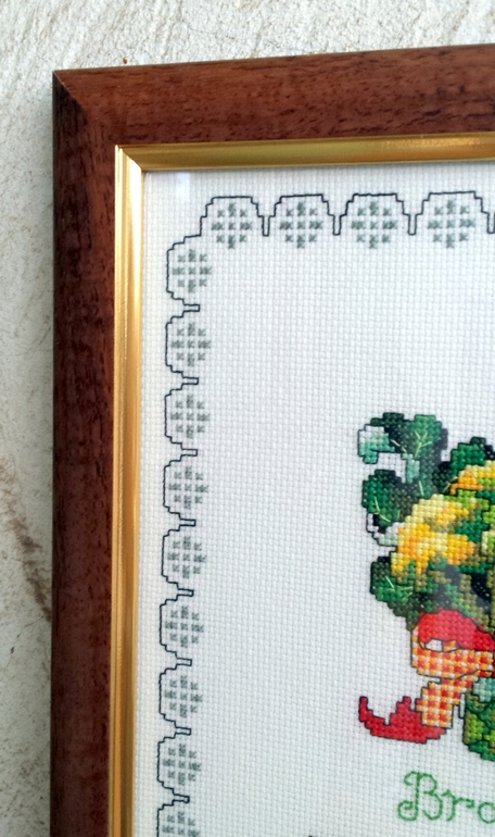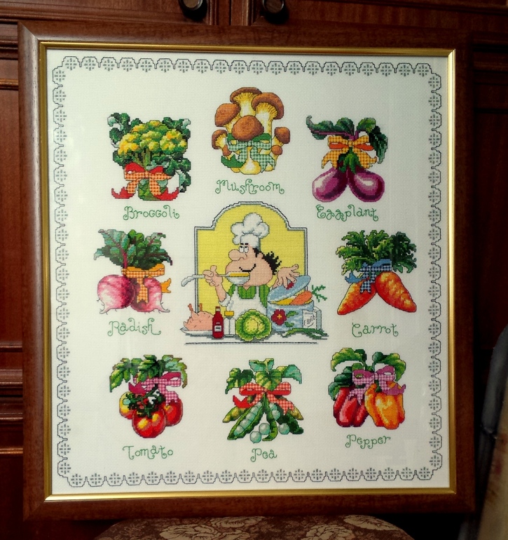 Вышивка крестом... Вышитый, если мне не изменяет память, в 2009 году. )) Да-да, самый-самый первый. Помню, как тогда, на заре моей вышивальной жизни, мне запали в душу эти овощи с бантиками, вот именно эти, и я по кусочками откапывала их в интернете, а потом нашла эту схему, где они все вместе, да еще и с поваренком. И как раз тогда я узнала о существовании такой игры, как РР. Робин был отправлен в путешествие и благополучно ко мне вернулся, потом пролежал более пяти лет в шкаПчике, а теперь вот наконец-то украшает отремонтированную кухню родителей!