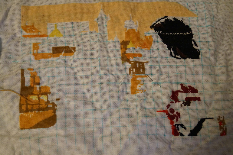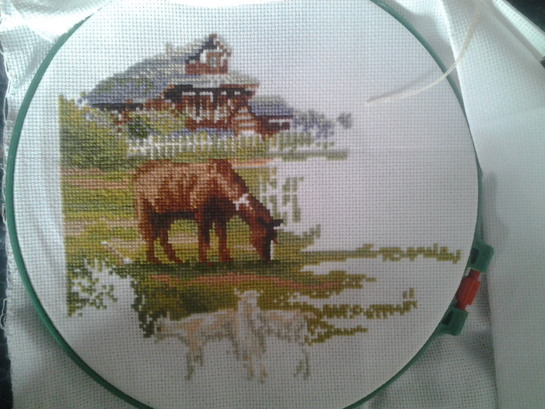 Я сегодня тоже молодец, вышила больше плана, но считать по факту выше моих сил. Гарантированно вышила 11 рядов плюс повылезала вверх прилично, эти 11 и запишу себе в актив. Остальное в следующие дни само учтется. Итого у меня 138*11-9 крестиков = 1509 +6% за канву = 1600 крестиков ровно ))