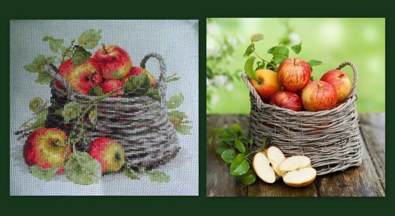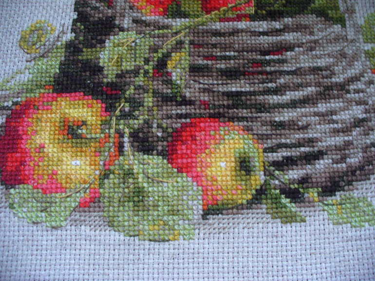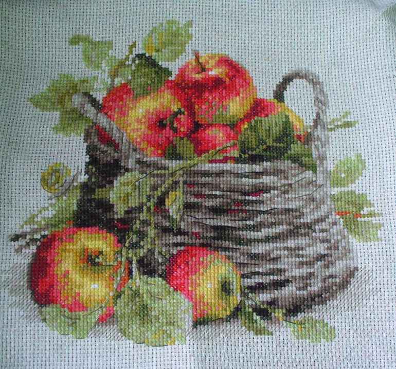 Вышивались эти яблочки очень легко и быстро на 10 льняной канве шерстяными ниточками. В работе используется крест в 2-3 нити, полукрест в 1-2 нити и бэкстич, практически вся зелень вышита блендами, размер 30 х30.