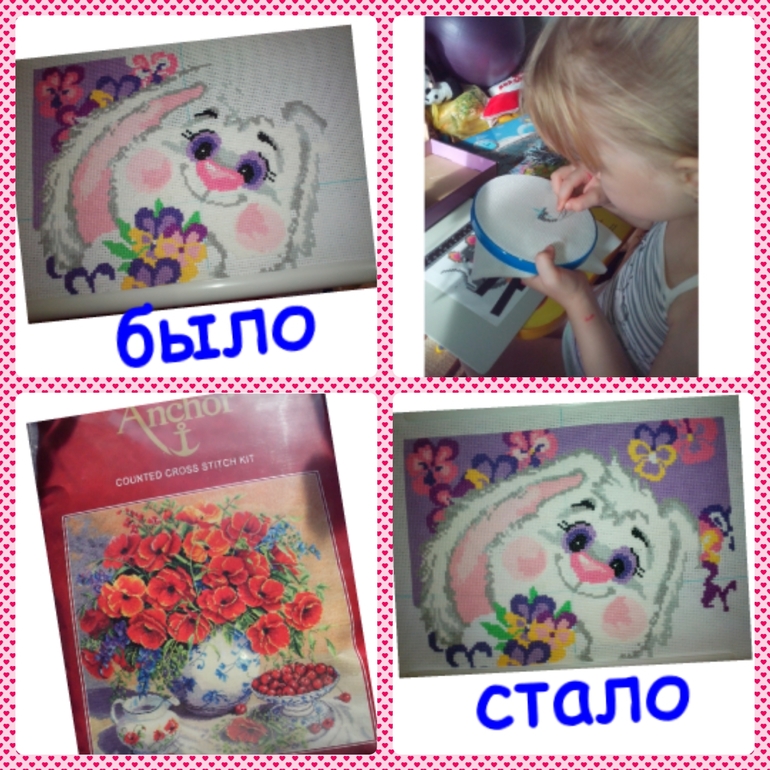 , ещё моя малышка захотела научиться вышивать, ей папа купил первый простой набор для вышивания, на фото старается чтобы крестики ровные были, вышивает мышку, посмотрим что получится ))), и ещё в пятницу ко мне пришёл набор Анкор Натюрморт с маками, в который просто влюбилась, увидев отшив у Юлии, я так рада что он у меня теперь есть