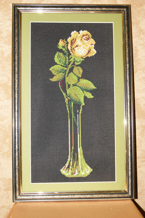 Первой из них вышилась роза. Вышивала подбором нитками гамма. Надо будет переделать фон под канвой, а то светит