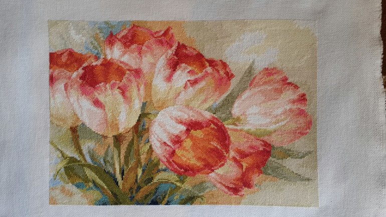 Не, я не стойкая. Бросать жалко... не люблю вышивать 2 или более работы одновременно. Поэтому тюльпаны нужно добить! У меня еще подушка не доделана и домик лежит давно...... Может так и порешим, что этот отчет станет заключительным