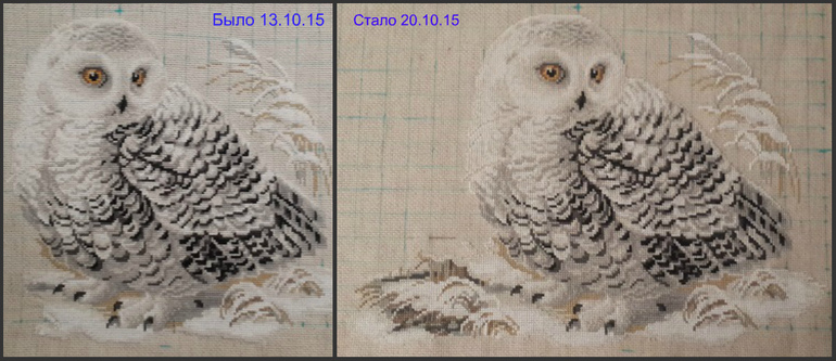 Привет, рукодельницы. Результаты у всех потрясающие, картины оживают прям. У меня неделька выдалась какая-то суетная и времени на совушку было мало((( умудрилась накосячить в счете крестиков, вот думаю теперь, распускать кусты ли нет))))