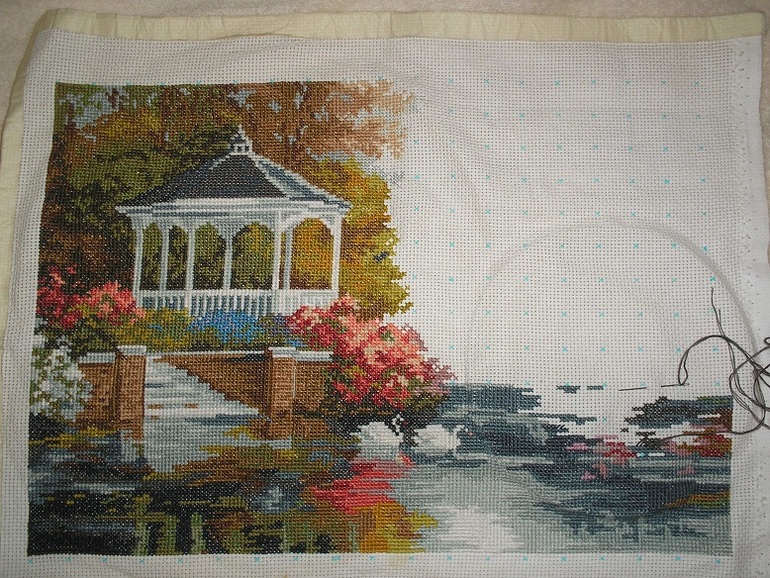 ну а чего?))) легла, тёплышко, хорошо.... канва сухая,нитки намокали просто и разметка поплыла))к шторе для ванной маленьким крабиком прицепила схему и вперед)))