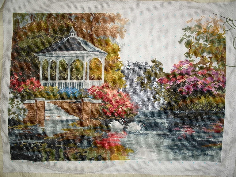 Погода нас не радует - серые осенние будни. А как начну вышивать свое озеро так сразу теплее становится. Я бы и сама не прочь поплавать в нем или вообще поселиться где-нибудь там поблизости.