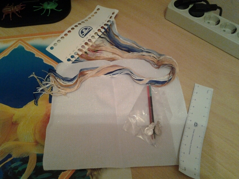 Канва с люрексом обметана со всех сторон,ниточки не плохие,не знаю ДМС это или нет!положили две иголочки,2стержня и 2 нитковдевателя(а кто знает стержни для канвы или схемы??)