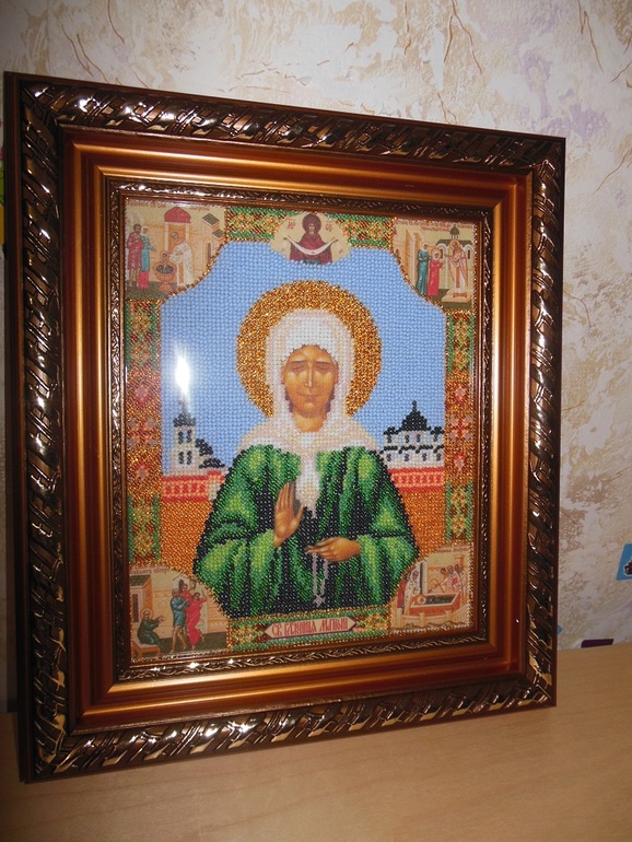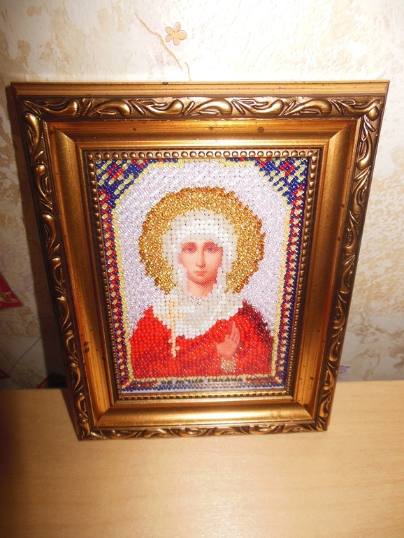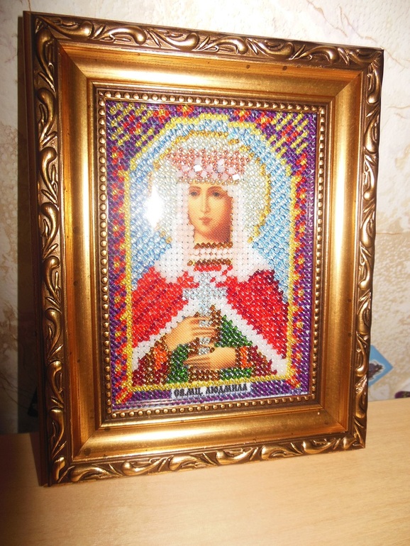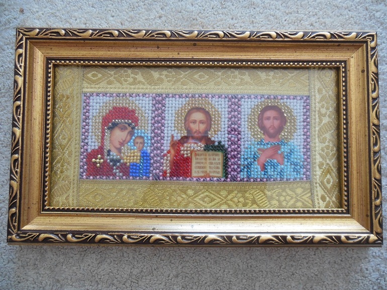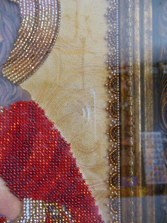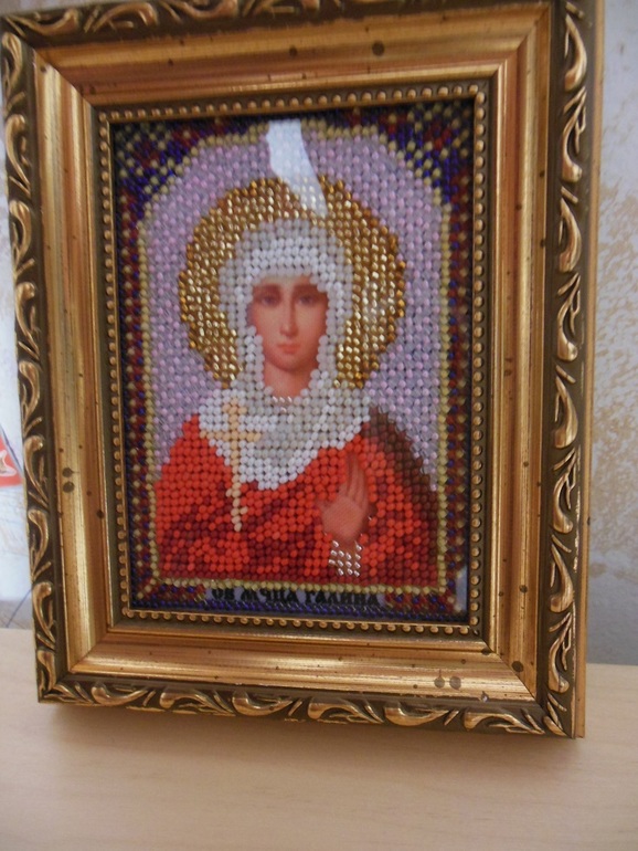 "Дошивала" за кумой. Она начала для свекрови и не прониклась бисером. Первый раз оформляла сама. Честно, не очень довольна.