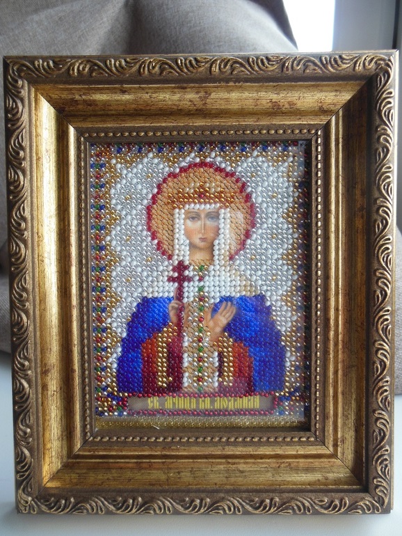 Что касается набора и самого процесса вышивания. Качество отличное, бисер замечательный + в комплекте порядка 6 иголок. Также присутствует информация о святой и молитвы. Вышивать на холсте я так и не приноровилась, опять же, для меня, капризен... вышивать необходимо только на рамке... я вышиваю без всего... Но из всех наборов. которые я пересмотрела, мне показался он самым красивым.
