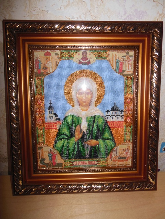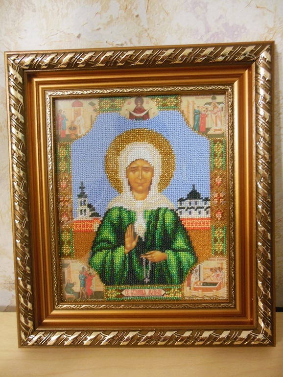 Матушка Матронушка.... Вышив половину, никак не могла закончить... находила массу отговорок, дел, забот.... лежала она три месяца... потом увидела рекламу сериала "Чудотворица" и под него за три дня на одном дыхании закончила. Смотрю на нее и душа наполняется почему-то нежностью... завтра муж повезет нашему педиатру в подарок.))