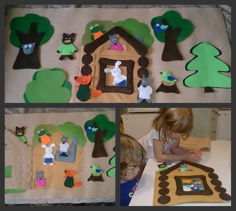 все животные на липучке, с ними можно играть как в кукольный театр. Осталось пришить деревья и всякие штучки добавить для интереса