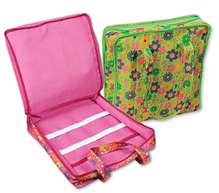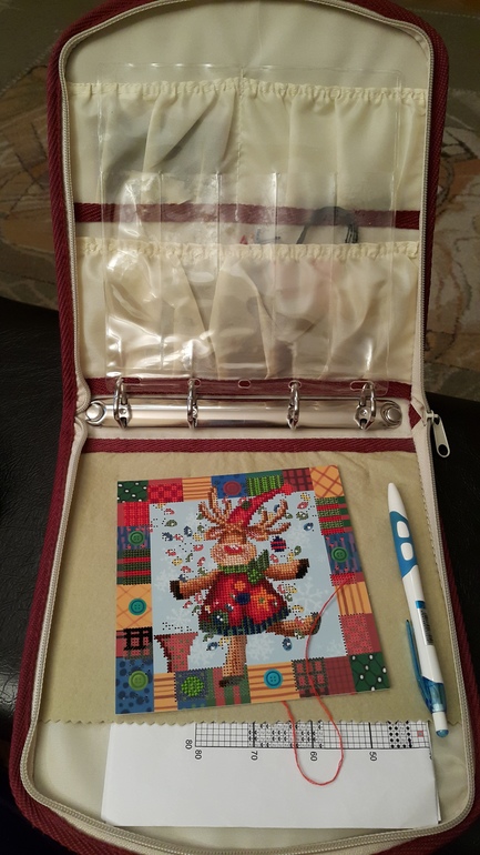 У меня была голубая от Гаммы. Соглашусь с Натальей, ее удобно брать в поездки, там много отделений для мелочей, не потеряются нитки-иголки-ножницы. Но: для меня она маловата. Она действительно только для маленьких работ, 13х18 - это максимум. Большие работы просто не влезут, да и не удобно будет доставать и раскладывать.