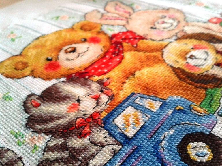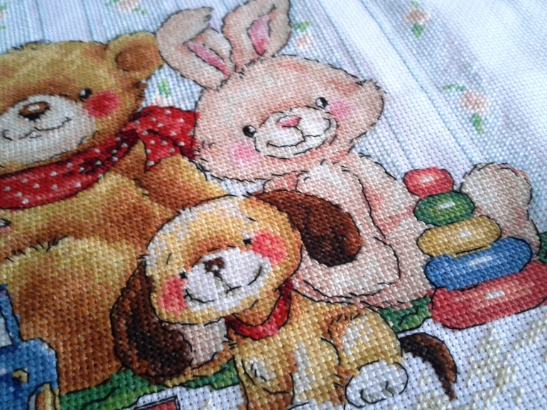 Мое впечатление: наборчик очень и очень приятный для работы!))) Первый раз шила нитками DMC и как и все от них в восторге. Цвета яркие и приятные. Не устанешь ни от одного оттенка) Путаться путались, конечно, но ложатся ровно и гладенько. И мотивчик такой ненавязчивый, где-то даже детский, но эти мордахи... вы только взгляните в их игрушечные глазки...так и манят пошалить вместе с ними