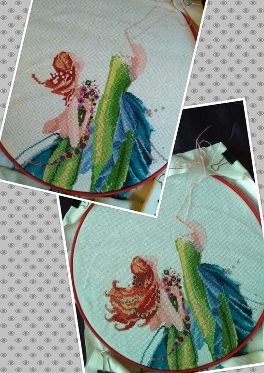Привет всем! Я сегодня с небольшим продвижением. Прическа для одной русалочки готова. Что-то я устала уже креативить, хочется вышивать тупо по схеме. Но у меня здесь надо держать ухо востро, то цвета не так сочетаются, тосхема не идеальна, то нитки не подобрать. Вот и темп низкий поэтому:)