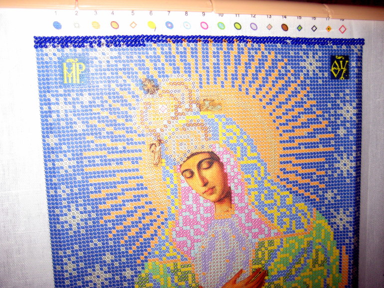Начала новую работу. На этот раз бисером. Остробрамская Богородица. Пришито 211 бисеринок.