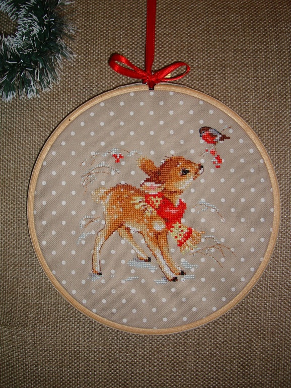 Набор "Алиса" Олененок. Заменила канву на равномерку Мурано и исполнила свою мечту оформила вышивку в пяльца. Видела много новогодних сюжетов оформленных в пяльца, а у самой руки никак не доходили, и вот собралась все-таки))