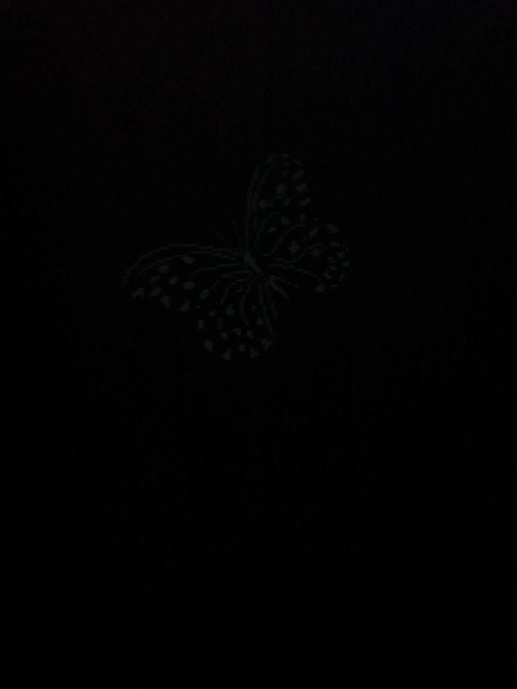 Бабочка вышита светящимися в темноте нитками :