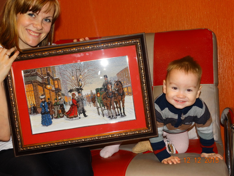 Мы хотели сделать эту картину с зелёным темным бархатным паспарту, но нам сказали что паспарту как бы продолжение картины зима значит что то зимнее. И действительно было красивее с такими оттенками.