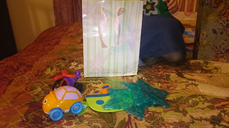 Сыночку досталась машинка и вертолетик. Он хоть и маленький, но машинки уже катает, на зуб попробовал))). А уж в ванную интересные штучки - нам то, что надо, купаться очень любит))