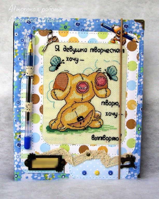 Вышивка крестомДевочки, любительницы Физзи Мун. Есть у меня вот такая вышивка, оформленная в хобби бук. Вышивалась по настроению для себя. Потом перешла на другой блокнот. А этот лежит, жалко мне его. В нем 4 разделителя. названия переделаю на ваши. На обложке в рамочку вставлю инициалы хозяина. На форзацах кармашки. Специальный карман для визиток. Стоимость 1200 р. + почта (за ваш счет).
