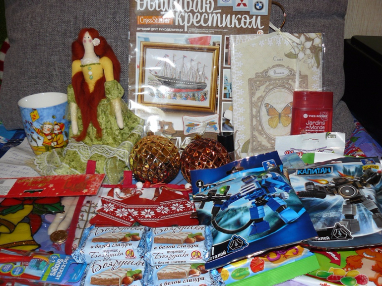 БолталкаА у меня вчера был праздник. И сегодня праздник, и завтра тоже будет праздник. У меня теперь праздник каждый день. Потому что у нас дома появилась романтичная и мечтательная девочка Вера-Алиса. Ее сшила САМА рукодельница Анна и вложила крупинку своей души. Сейчас Вера-Алиса светит на меня глазками-бусинками и мечтает мои мечты. Белый кролик все время о ней спрашивал. Теперь они вместе, ну и Адмирал с океана, но это уже другая сказка. А почему я пишу в наше сообщество? Потому что кроме девочки, прилетели конфетки, мармеладки, вкусняшки, чашечка, елочные игрушки, и другие игрушки я не успела рассмотреть, надеюсь найти их на елке)) и много всего интересного, включая журнал ВЫШИВАЮ КРЕСТИКОМ !!! Анна, слов нет, один восторг